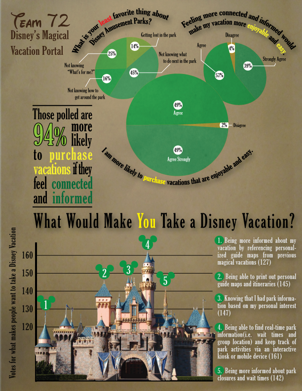 In 2009 I entered Disney's Imaginations contest with a friend, Austin Silva. As part of the entry we polled a number of people online. We used it to build a strong story around giving people more information. This was before Disney applicaiotns were ever released for guests in the park. The full product definition included line times, congested areas, and a fairytale storybook created from the attrations visited and photopass pictures taken.